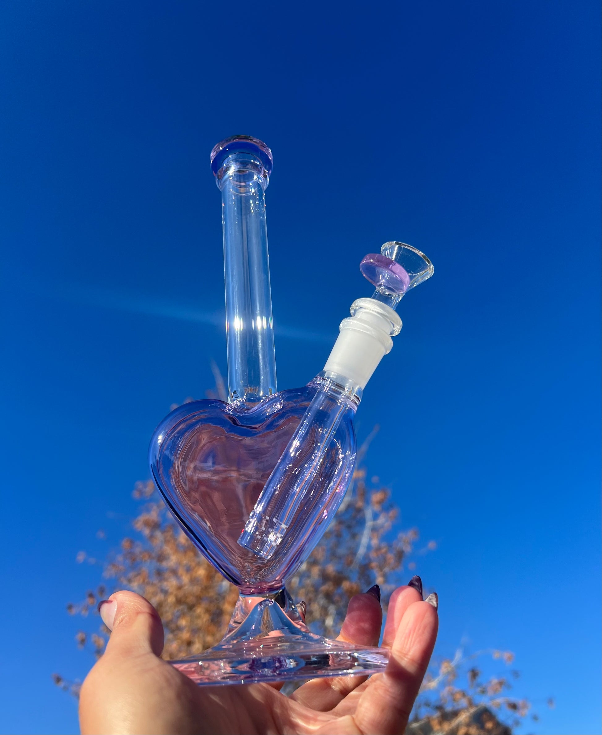 Heart shaped water piece with removable down stem and 14mm bowl piece included. Adorable and functional